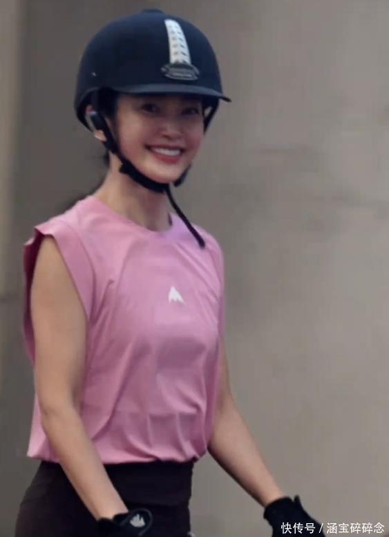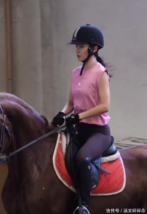 画面中,李冰冰身穿粉色背心搭配深红色瑜伽裤,骑在马背上驰骋,动作十分娴熟,看得出平时没少在马场练习。